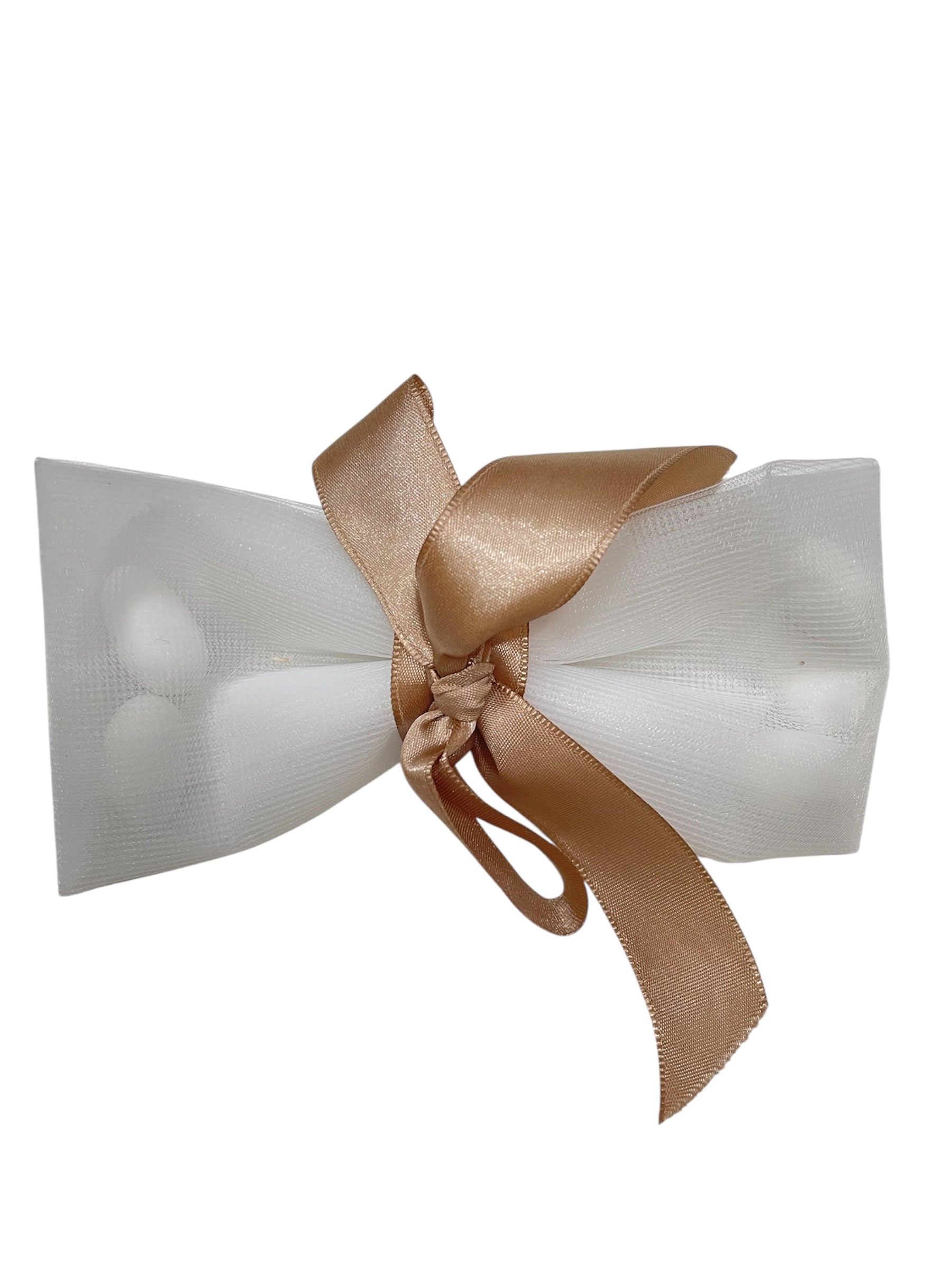 Μπομπονιέρα γάμου με τούλι δεμένη με σατέν κορδέλα σε σχήμα φιόγκου.Περιέχει 5 κουφέτα αμυγδάλου Χατζηγιαννάκη σε τούλι περιτύλιξης. Δυνατότητα επιλογής κουφέτου. Χρονος παράδοσης 1-2 εβδομάδες. Για την διεκπεραίωση της παραγγελία, απαιτείται 50% προκαταβολή. Τούλι και κορδέλα σε χρώματα της επιλογής σας. Συμπληρώστε στο πεδίο Σχόλια/Λεπτομέρειες τα χρώματα που επιθυμείτε. Αποστολές γίνονται σε όλη την Ελλάδα, Κύπρο και Εξωτερικό.