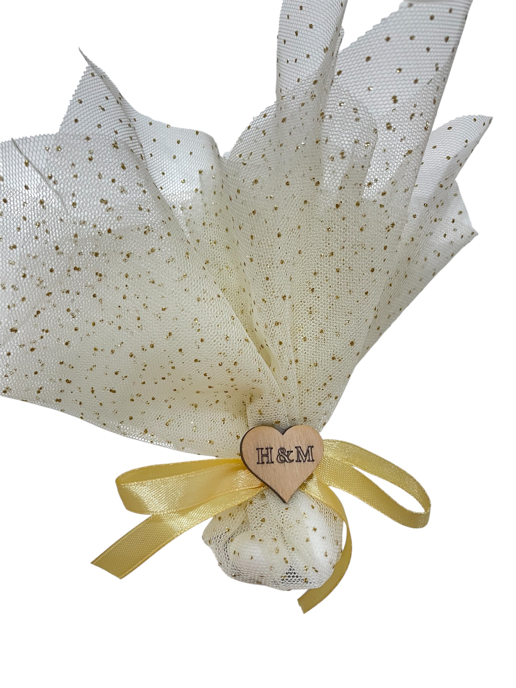 Μπομπονιέρα τούλινη με καρδιά και τα αρχικά